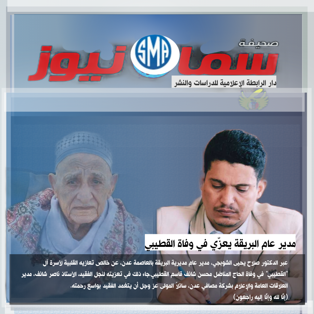 جاء ذلك في تعزيته لنجله الأستاذ ناصر شائف مدير العلاقات العامة والإعلام بشركة مصافي عدن، وإخوته، وجميع أفراد الأسرة الكريمة وآل ” القطيبي ” كافة، بمصابهم الأليم.
