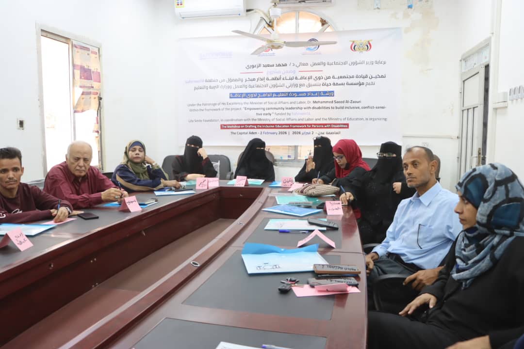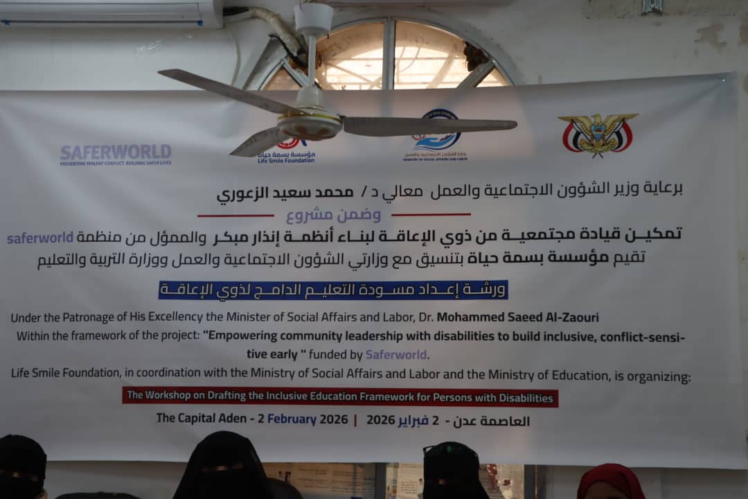 انطلقت صباح اليوم في العاصمة عدن ورشة عمل لإعداد مسودة التعليم الدامج لذوي الإعاقة، بالتنسيق بين وزارتي الشؤون الاجتماعية والعمل، والتربية والتعليم، وبرعاية كريمة من معالي وزير الشؤون الاجتماعية والعمل الدكتور محمد سعيد الزعوري، وذلك ضمن مشروع «تمكين قيادة مجتمعية من ذوي الإعاقة لبناء أنظمة إنذار مبكر»، الممول من منظمة Saferworld، وتنظيم مؤسسة بسمة حياة.