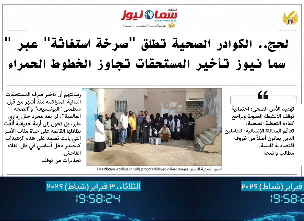 في ظل أوضاع معيشية بالغة التعقيد، وجه الكادر الصحي المشارك في حملات التحصين والأنشطة التكاملية بمحافظة لحج والمحافظات المحررة، مناشدة عاجلة عبر صحيفة “سما نيوز”، واضعين معاناتهم أمام طاولة وزارة الصحة العامة والسكان ومدير مكتب الصحة بالمحافظة، والمنظمات الدولية المعنية.