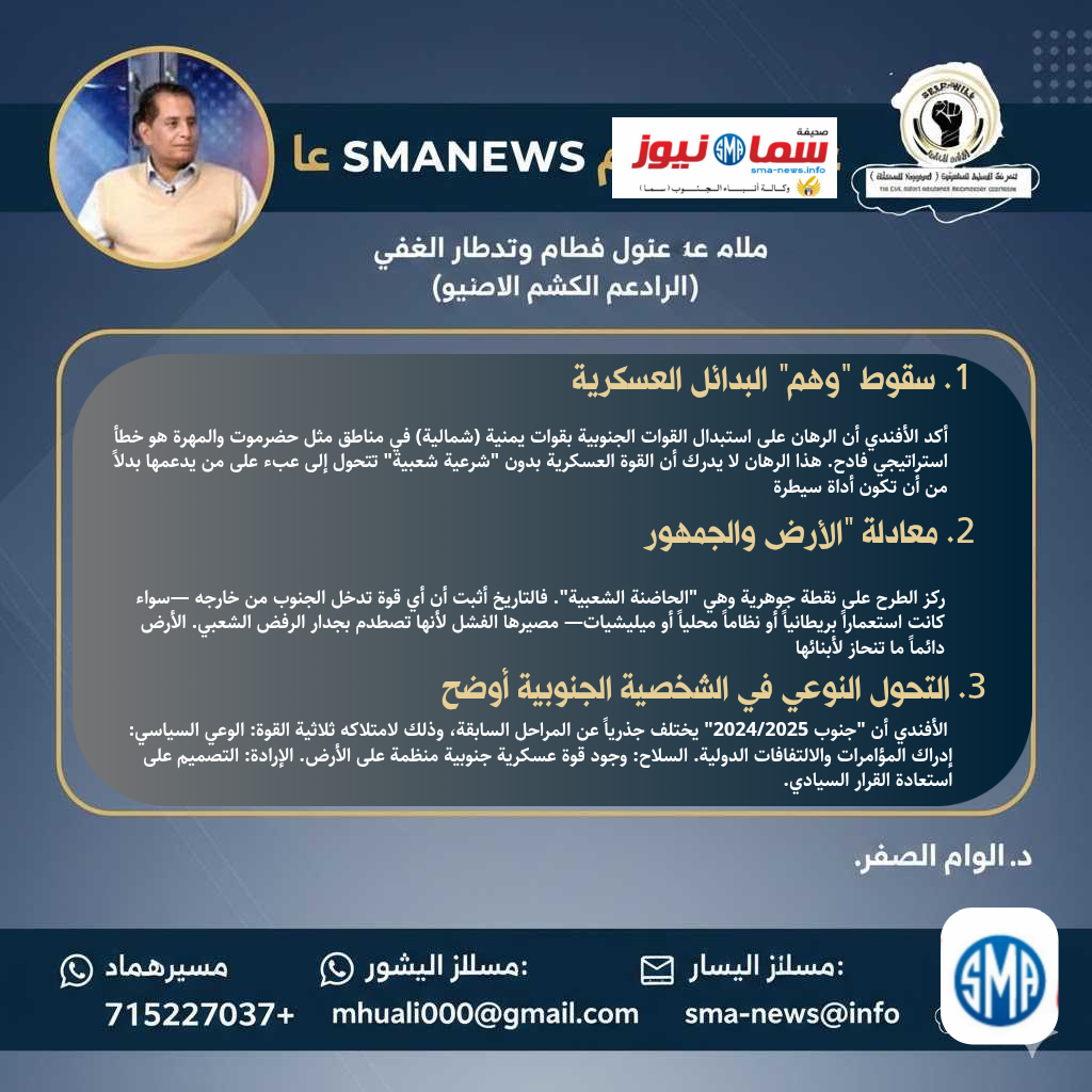 إن محاولات الالتفاف على إرادة الشعب الجنوبي عبر أدوات عسكرية مستوردة لن تجلب إلا مزيداً من عدم الاستقرار والخسائر الاستراتيجية لمن يمولها. الحل يبدأ بالاعتراف بالحقوق، وينتهي بدولة فيدرالية تحمي الجميع.