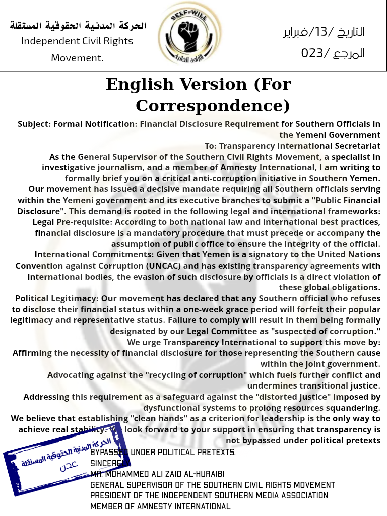 - إسقاط صفة التمثيل: أي مسؤول يرفض الإفصاح المالي يفقد فوراً حقه في التحدث باسم الجنوب أو تمثيل تطلعات شعبه.