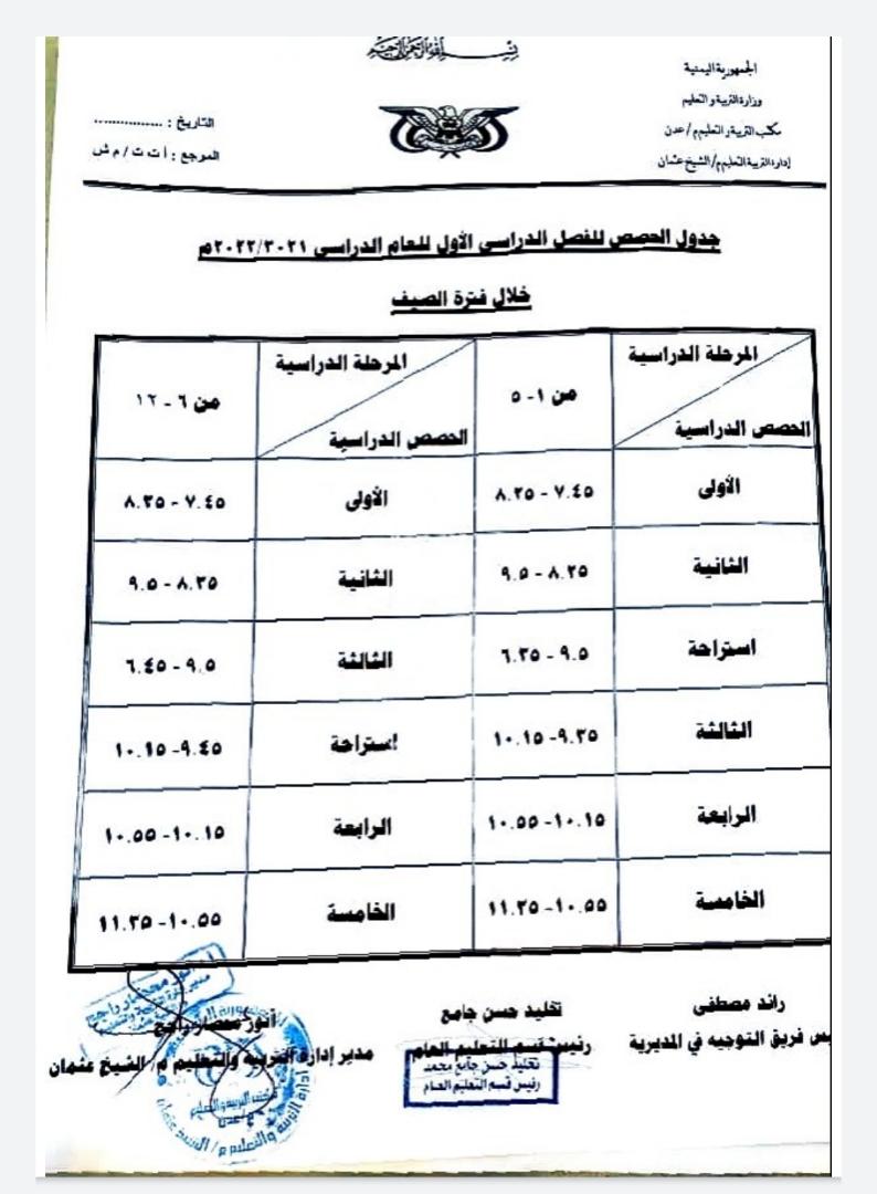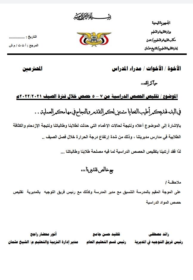 أصدر مدير إدارة التربية و التعليم بمديرية الشيخ عثمان محافظة عدن الأستاذ/ أنور محضار راجح تعميما قضى بموجبه تقليص عدد الحصص الدراسية في مدارس مديرية الشيخ عثمان من سبع 7 حصص إلى خمس 5 حصص خلال فترة فصل الصيف