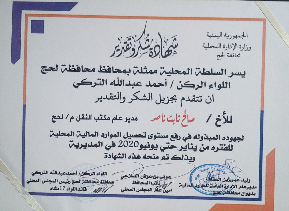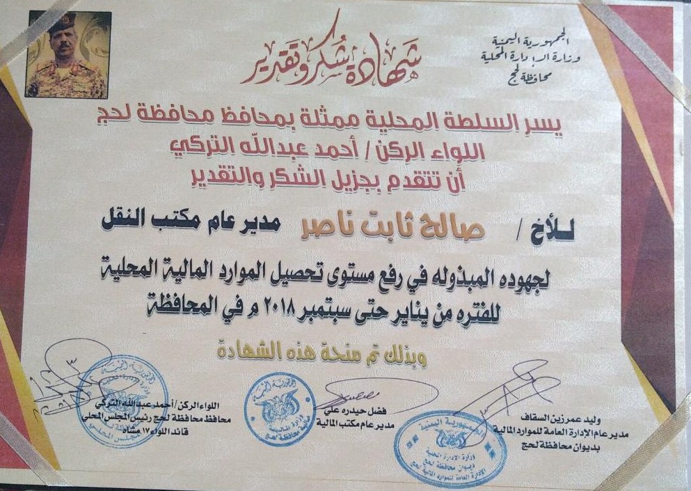 حقيقة أقولها دون مراء و لا رياء و لا مجاملة فمن لا يشكر الناس لا يشكر الله و مدير النقل بمحافظة لحج الأستاذ/ صالح ثابت قد استحق و بكل ما تحمله الكلمة من معنى كلمة الشكر و التقدير و العرفان لجده و اجتهاده و إخلاصه و تفانيه في العمل و أمانته و نزاهته و شفافيته في الأداء الوظيفي و تحصيل الإيرادات و توريدها إلى مكانها الطبيعي في خزينة الدولة الأمر الذي فرض احترامه و تقديره على كل من عرفه و عايشه و زامله في العمل