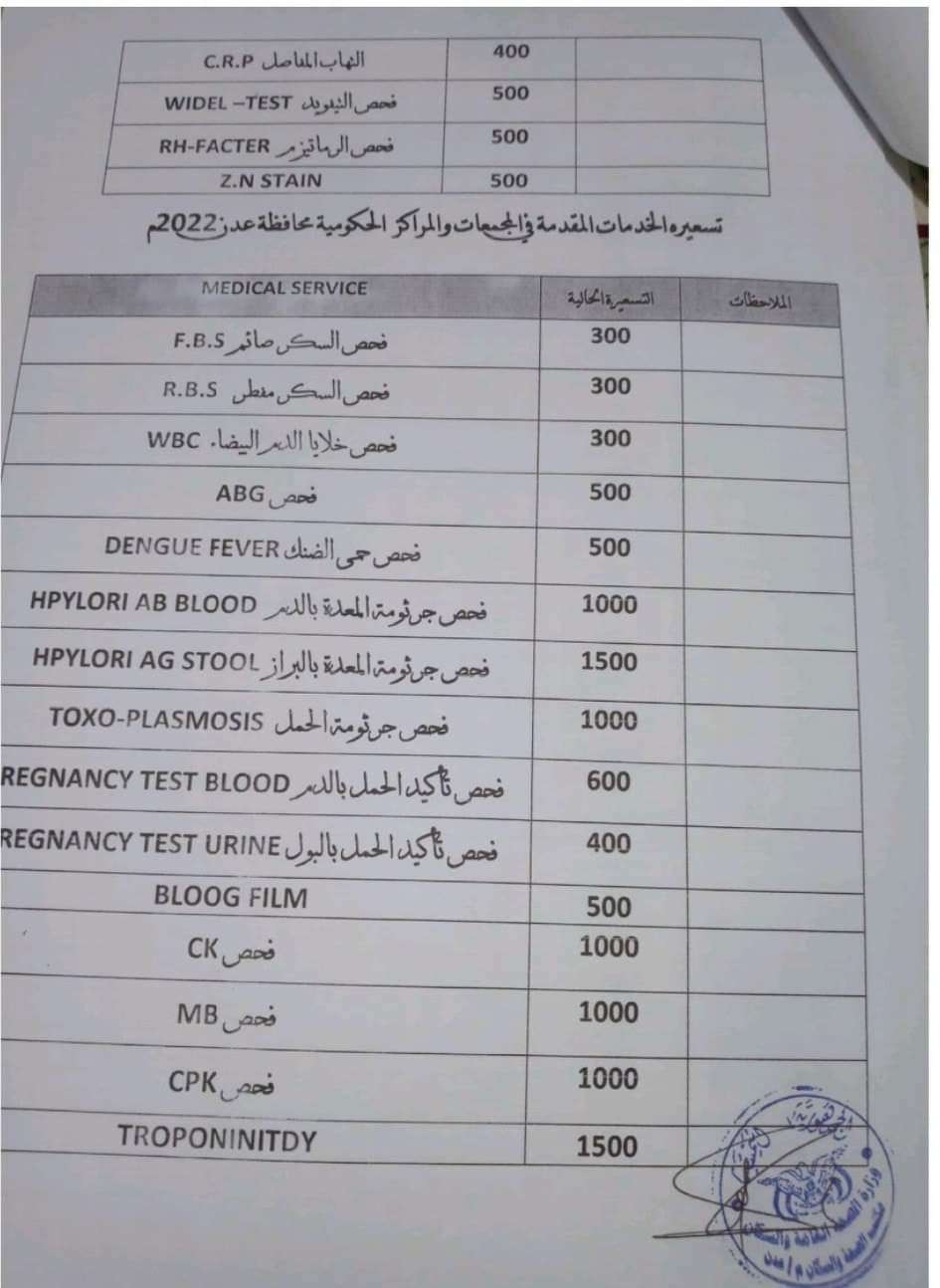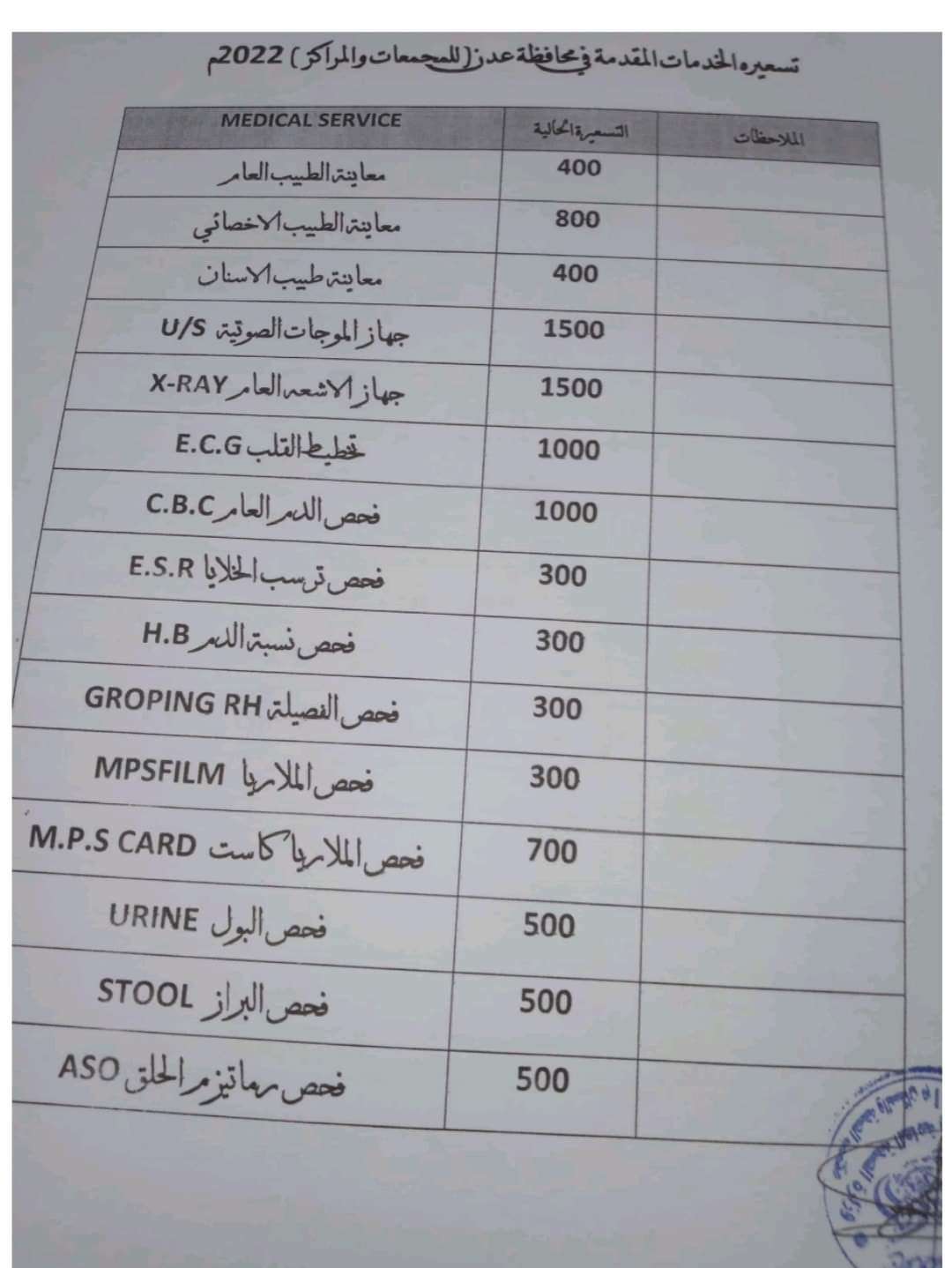 قال مكتب الصحة بالعاصمة عدن أن قرر رفع أسعار الخدمات الصحية والعلاجية المقدمة للمواطنين في عموم المراكز الصحية بالمدينة.
