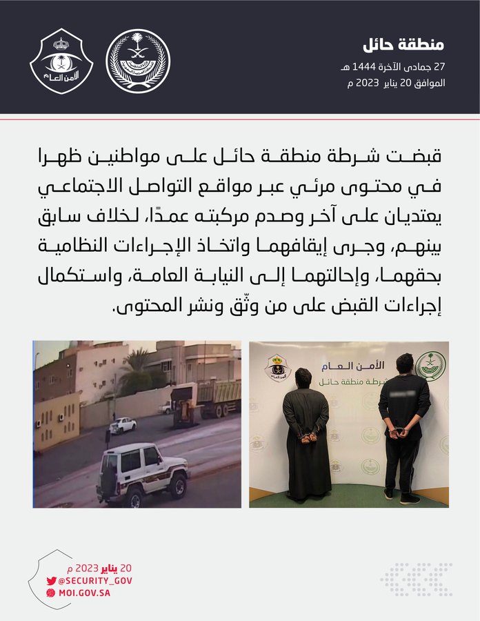 وأوضح الأمن العام في بيانه قائلا: “قبضت شرطة منطقة حائل على مواطنين ظهرا في محتوى مرئي عبر مواقع التواصل الاجتماعي يعتديان على آخر وصدم مركبته عمدا، لخلاف سابق بينهم”.