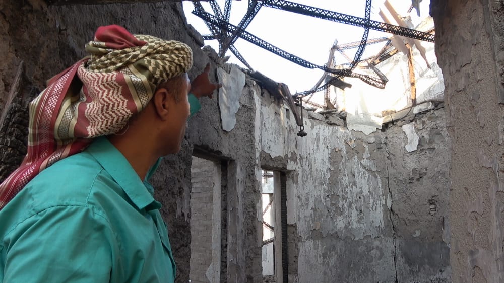 يصطحب محمد عسيري طفله “سعيد” (5 أعوام)، للذهاب الى منزله ليبحث بين أغراض منزله المحروق ويستلهم ذكريات الماضي حيث عاش منذ طفولته بمنزله..